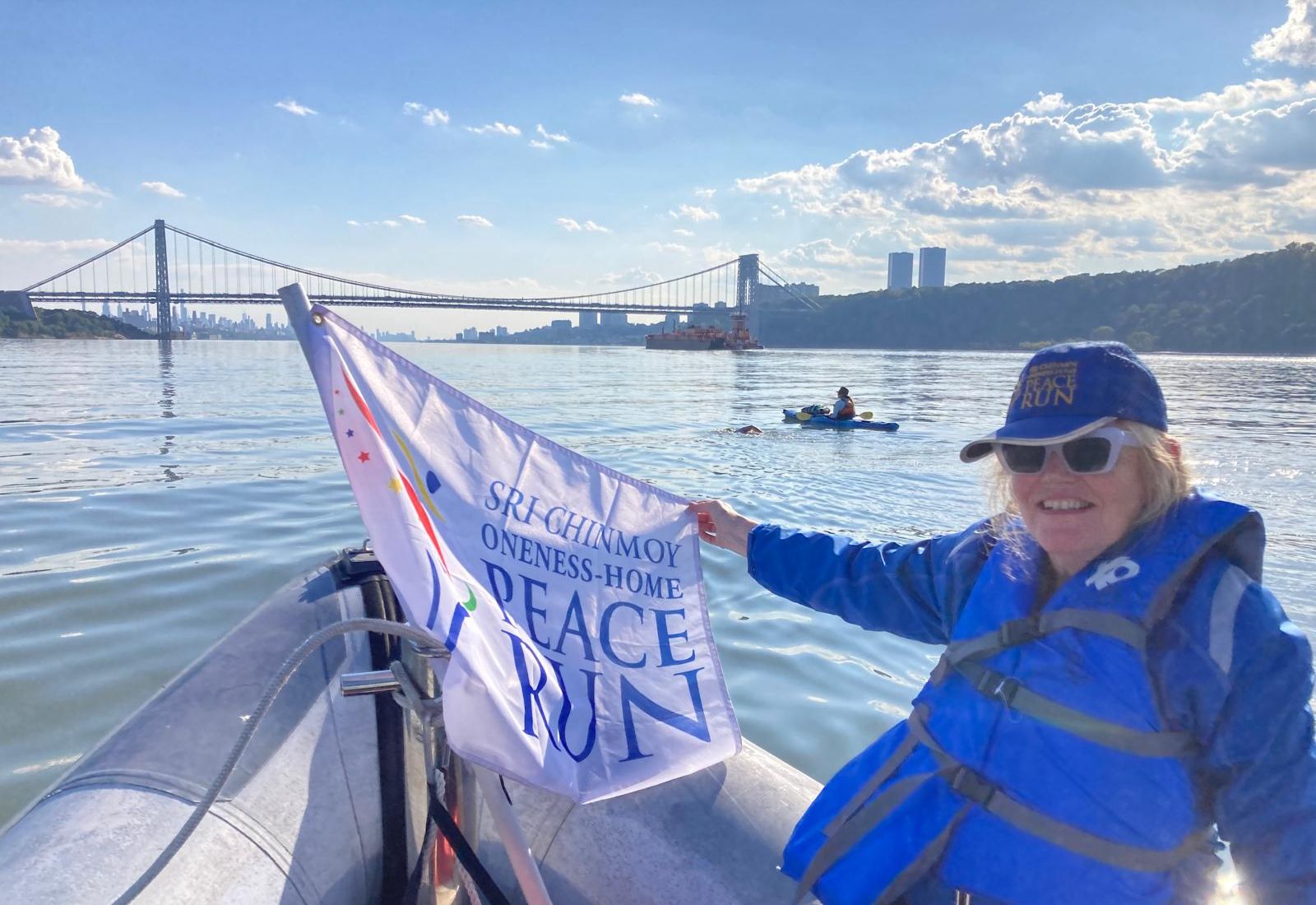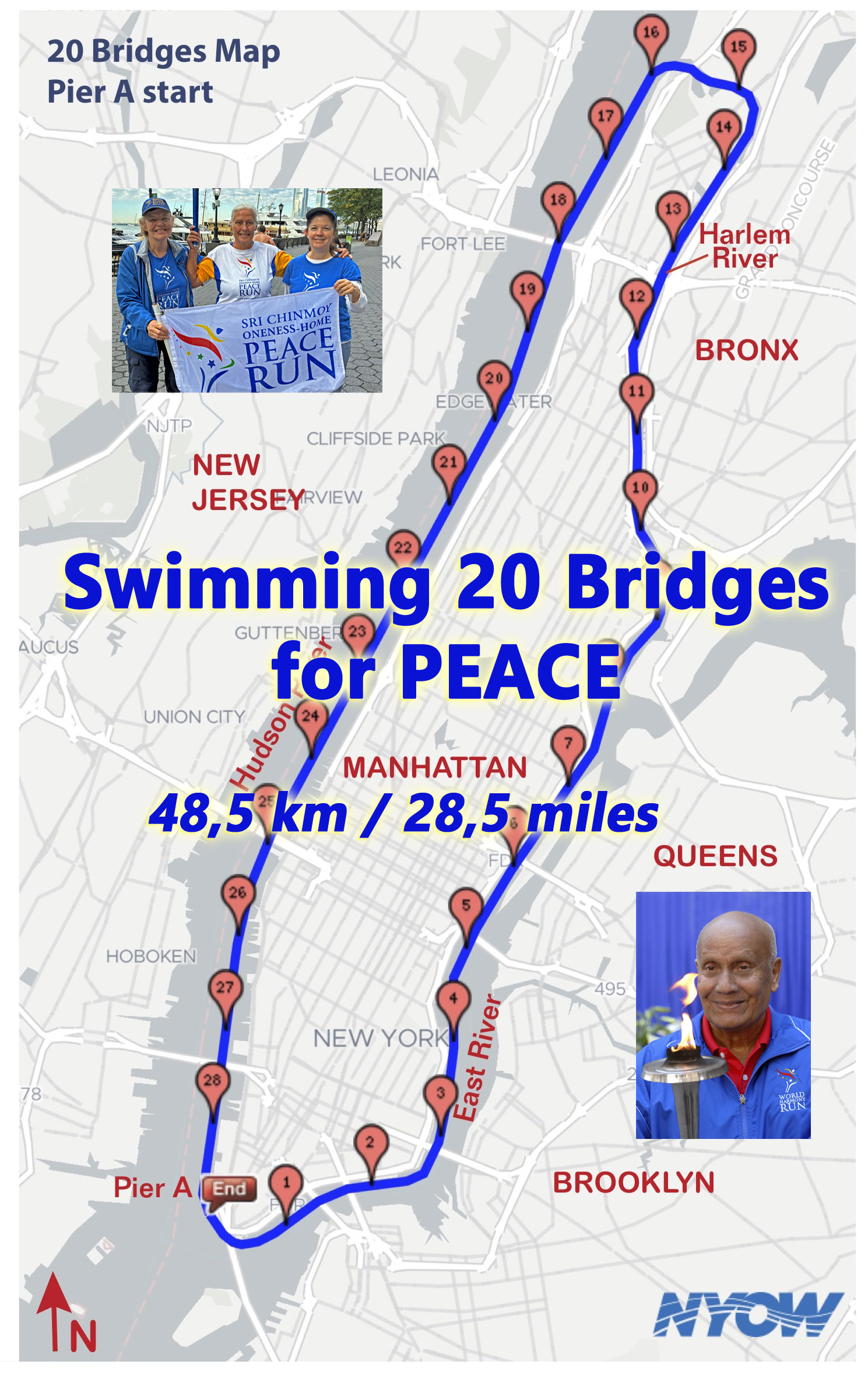 On Sept. 12, 2025, Sri Chinmoy Marathon Team and Peace Run team member Vasanti Niemz (68) from Heidelberg, Germany, accomplished the iconic “20 Bridges” open water marathon swim around Manhattan Island, dedicating it to PEACE in honour of the United Nations 80th anniversary, the 55th year of Sri Chinmoy Peace Meditations at the United Nations and the International Day of Peace coming up on Sept. 21st.