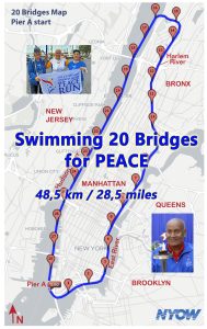 At the moment she is the oldest female ever to complete this 48,5 km (28,5 mile) current-assisted swim, with a time of 9 hours and 34 minutes. The Peace Torch of the Sri Chinmoy Oneness Home Peace Run was lit at the start and at the end and carried on the boat by her local boat crew Pipasa and Jamini. The swim is organised by New York Open Water (NYOW), who provide the accompanying safety boat and kayak including pilot, observer and kayaker. It was Vasanti’s longtime dream to swim around Manhattan, but for a slower swimmer it became only possible recently, with separate starts now in smaller groups of similar speed and the start time adjusted accordingly to the tidal currents, so the swim would be mostly current-assisted.